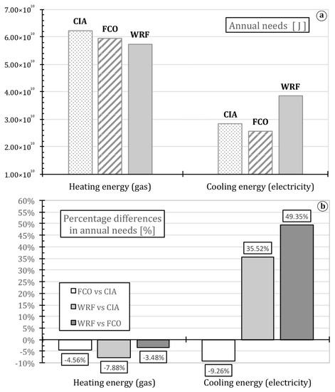 (a) Annual primary energy needs (J); and (b) percentage differences (%) in the energy consumption of (i) Fiumicino vs. Ciampino; (ii) WRF vs. Ciampino; and (iii) WRF vs. Fiumicino.