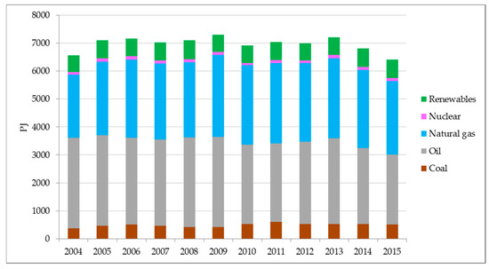 According to data from the Mexican Ministry of Energy [6], internal primary energy supply in Mexico from 2005 to 2015 has followed a downward trend with some ups and downs in the intermediate years, as can be seen in Figure 1. In this period, the main energy source is hydrocarbons, whose share in the total went from 83% to 80%, and although crude oil production has decreased, it has been compensated by the increase in gas production. The share of renewables in primary energy is still low, around 10%, and the rest has been produced by coal, which has also risen, and nuclear.
