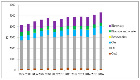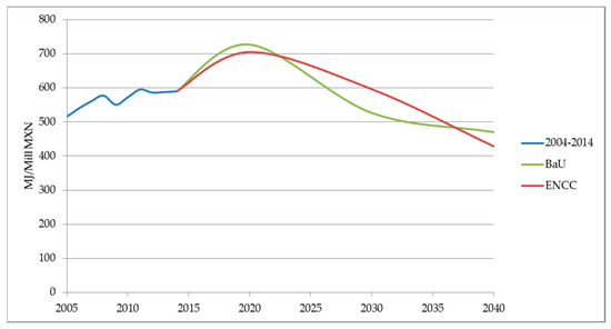 The energy efficiency indicator chosen in this analysis is final energy intensity, defined as total final energy consumption divided by gross domestic product (GDP) at current prices. The lower the energy intensity the higher the efficiency is. To calculate the energy intensity evolution in the past, data from SENER for the final energy consumption [6] and data from INEGI [35] have been used. Results are shown in Figure 16. From 2004, the energy intensity has grown in a continuous way, except for 2009 when GDP and final energy were 1% and 5% lower than in 2008, respectively, as a consequence of the financial crisis. That means that energy efficiency in final consumption in Mexico has decreased in the period of 2004–2014.