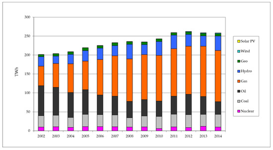 The higher the value of the index, the more diverse the system is. In this case, the index has increased 15%, from 0.98 to 1.12, in the period 2004–2014. This is the result of the introduction and growth of renewable sources: geothermal, solar, wind, and biogas (Figure 15).