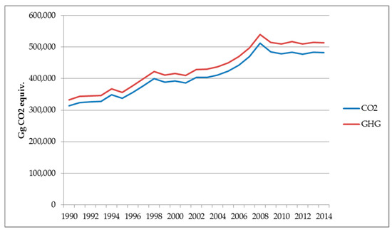 The fuel combustion emissions in the energy sector increased 58% from 1990 to 2010, with an average annual growth of 2.4% (Figure 5). The energy sector, comprising electricity and heat production and transport, was the main contributor, with 85% of the total in 2014 [10].