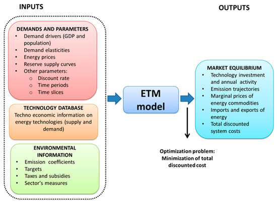 In general terms, ETM is a multi-regional, global, and long-term energy model of economic equilibrium which uses optimization methods to provide the optimum energy system composition in terms of social wealth and sustainability at the minimum cost. Besides, it is a bottom-up, technology-rich model with thousands of technologies well defined by technical, economic, and environmental parameters.