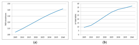 One of the main data inputs is the end-use energy services demand. The projections of the demands are the result of the general equilibrium models GEM-E3 [30] and Gtap [31]. Input data for these models are GDP and population. The projections for those parameters for Mexico are represented in Figure 7.