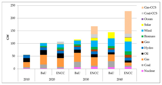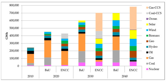 First results demonstrate that the clean energy targets are met, even in BaU scenario by 2040, as can be seen in Figure 8. In this scenario, the electricity generation with clean technologies goes from 20% in 2010 to 33% in 2030 and 48% in 2040, the main technologies being solar, wind, and nuclear (see Figure 9). Electricity generation with fossil fuels comes from gas followed by coal technologies. However, in the ENCC scenario, clean technologies generate almost 100% of the electricity from 2030. In this scenario, there is an important contribution of natural gas with CCS technologies, which even substitutes the generation with coal with CCS technologies abandoned in 2040. Among the renewables, solar, wind, and geothermal present the highest shares.