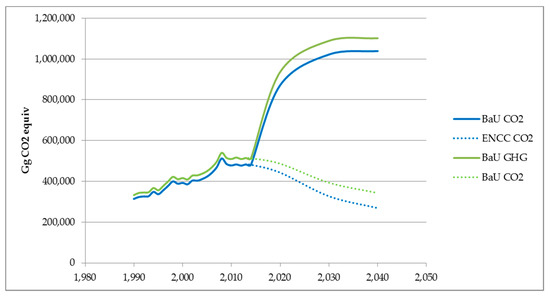 GHG and CO2 emissions in the medium and long term for BaU and ENCC scenarios.