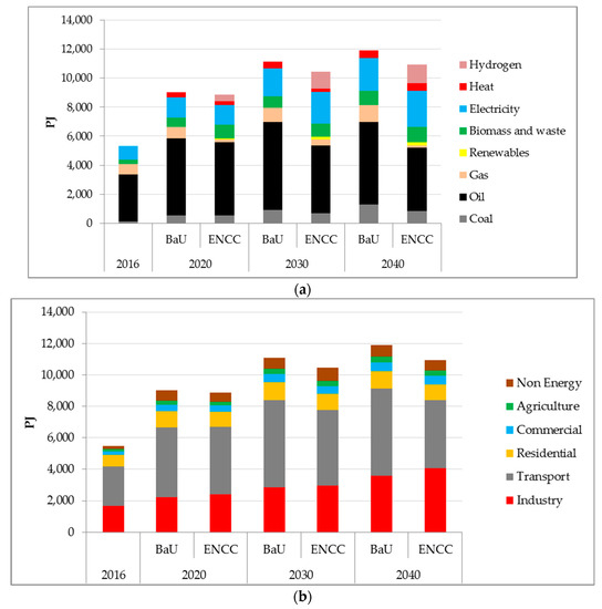 Final energy consumption by fuel and sector for BaU (a) and ENCC (b) scenarios.