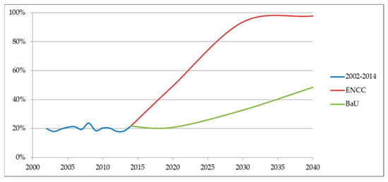 The historic evolution of the share of clean energy sources in the electricity generation has been calculated from data from the Mexican Ministry of Energy [33]. This share has gone from 20% in 2002 to 22% in 2014. The evolution in the medium and long term calculated with the ETM model in both scenarios is quite different. While in the BaU scenario the growth of non-fossil sources share is constant with an average growth rate of 50%, in the ENCC the increase is much higher, reaching 94% in 2030 and 98% in 2040. The results of the past and future evolution are shown in Figure 12. Similar results regarding clean energies penetration in electricity production transport can be found in [20] when using the IMAGE and ECN-TIAM models.