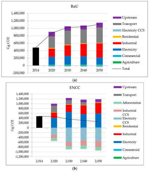 CO2 emissions by sector in the BaU (a) and ENCC (b) scenarios.