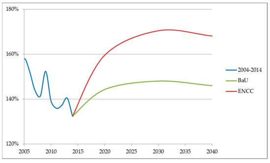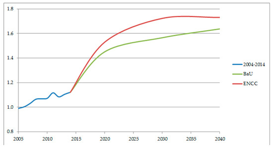 Regarding energy independence, the trend from 2004 to 2014 is to decrease. As has been seen in Figure 1 and Figure 3, while national primary energy remains constant in the period, final consumption continuously grows, so energy dependence is higher from one year to the other. When the results of the optimization exercise in the medium and long term are analyzed, the evolution of the energy independence in both scenarios is quite different. While in the BaU scenario the trend is to start increasing again, in the ENCC one, it grows at the beginning but then reduces, always being above 140%. Although both primary and final energy in ENCC increase from 2020 to 2050, at the end of the period, the growth rate in the final energy consumption is higher than in the primary energy production, mainly because at the end fossil fuel’s national production experiences reductions around 10%.