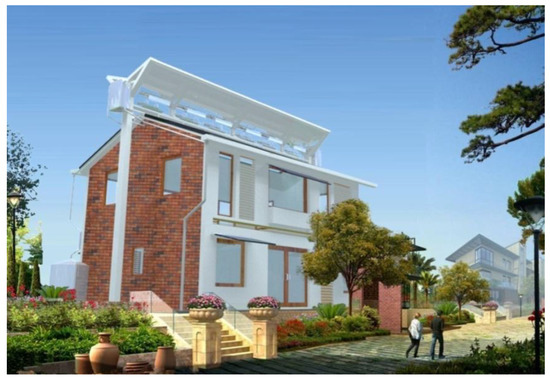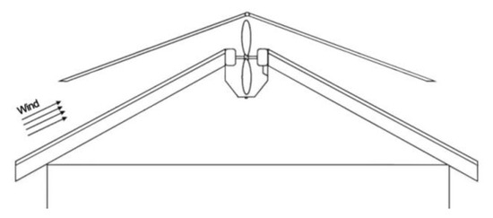 In addition, this eco-roof system with the VAWTs does not require a large tower and can be installed on any building with a double slope roof, refer to Figure 5. Moreover, the eco-roof system can be adjusted to fit a variety of roofs with different inclination angles without prejudice to the building structure.