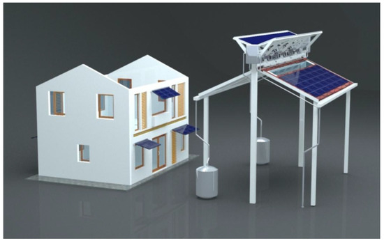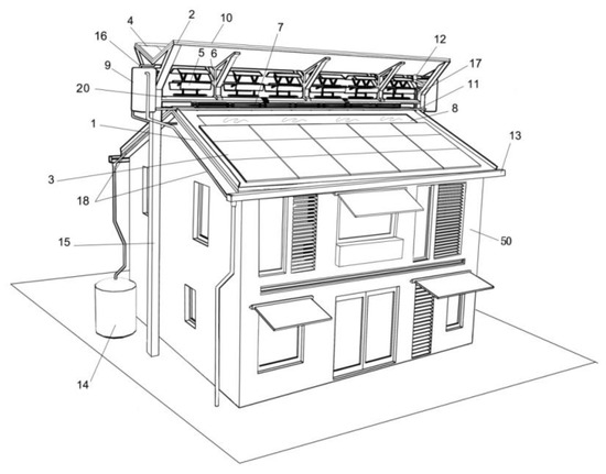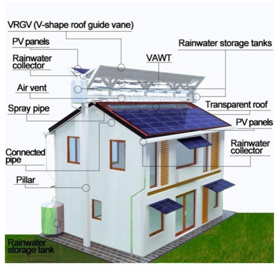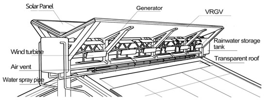 At the same time, the VRGV also acts as the flow path for collecting and leading rainwater towards the water storage tanks. The rainwater stored was mainly channeled to an automated cooling and cleaning system that washes solar panels embedded in the sloped roof to keep them efficient. Thus, it is not necessary to have an extra structure to harvest solar energy and rainwater due to the multipurpose feature of the VRGV design which has higher efficiency in energy production. The installation of this VRGV on a double slope roof to collect wind, solar and rainwater can give a full play to Malaysia’s climate advantage (i.e., strong solar radiation and rainfall), which would maximize the energy production and savings [40].
