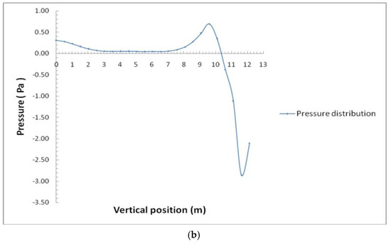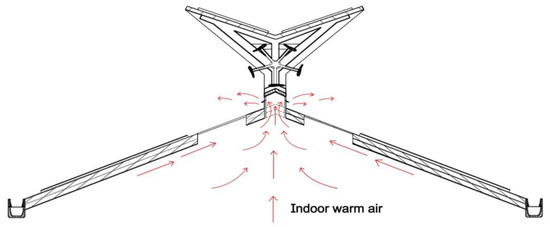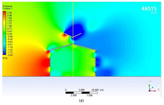 The air vents along the ridge of the roof are provided to ventilate heat out from the building, as shown in Figure 7. When the wind flows through the region between the upper wall duct of the VRGV and the pitched roof, the wind is accelerated and creates a relatively low-pressure area at the roof ridge. The warm air indoor possesses higher pressure, hence, natural convection happens due to the pressure difference between indoor and outdoor, refer to Figure 8a,b. Moreover, side louvers are provided to prevent rainwater from entering the building through the air vent.