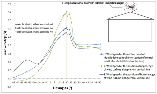 Wind speed distribution along the central vertical line between the two-layers of the roof structure at different tilt angles of the VRGV [46].