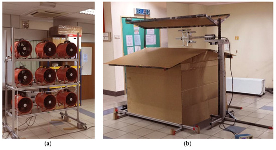 (a) Ventilation fans; (b) Indoor experimental set-up of a VAWT integrated with VRGV on top of a double slope roof.