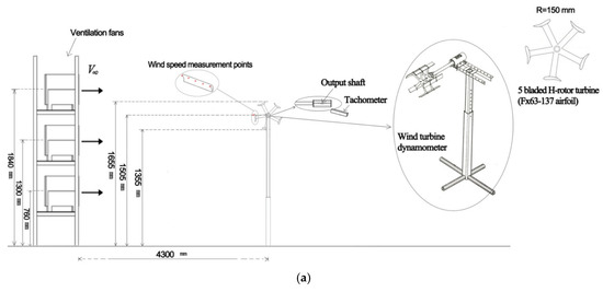 The experimental setup mainly consists of a mock-up building with a double slope roof, a 5-bladed H-rotor VAWT, VRGV structure, an anemometer, a dynamometer controller system and ventilation fans. The dimensions of the mock-up building are 1600 mm (length) × 1420 mm (width) × 1305 mm (height), which are 1 to 10 ratio reduced to the actual size of the building. The VRGV structure has a length of 1600 mm, a width of 660 mm and a height of 1821.8 mm. The inclination angles of the VRGV and the gable roof is 19.5° and 15°, respectively. A value of 19.5° is the optimum tilt angle for the VRGV to augment the wind speed as wind passes through the wind turbine between two-layers of the roof structure [47]. Furthermore, 15° is the optimum roof inclination angle for solar PV panels obtaining the most solar radiation in Malaysia [45]. In this experiment, the wind flow was produced by a series of ventilation fans that were arranged in a 3 × 3 equally spaced configurations, refer to Figure 11a. The wind direction is set to be parallel to the ground and perpendicular to the building model [48]. The air blown by these ventilation fans can reproduce similar turbulence and swirling flow in the field environment. In the present experiment, a 5-blade FX63-137 airfoil H-rotor VAWT with a diameter of 0.3 m was chosen and mounted on a experimental mockup. Figure 12 shows the detailed parameters of the lab experiment setup.