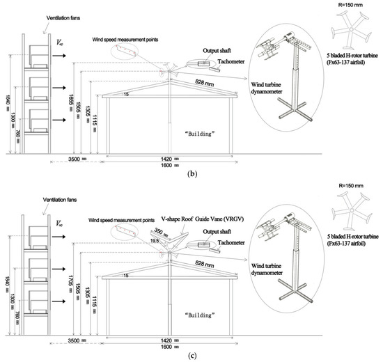 (a) Detail dimensions of the experiment set-up for an open rotor VAWT; (b) Detail dimensions of the experiment set-up for a VAWT installed on a double slope roof; (c) Detail dimensions of the experiment set-up for a VAWT embedded in the double slope roof and VRGV.