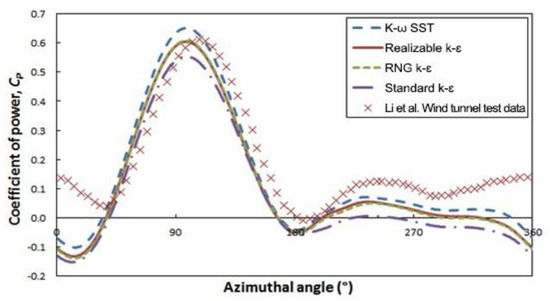 Comparison of Cp for different turbulence model versus azimuthal angles for a complete revolution. Reprint with permission [61]; 2018, Elsevier.