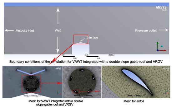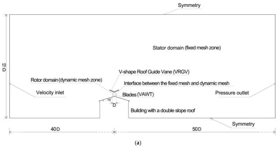 In this 2D numerical study, the consideration was limited on the wind velocity, rather than pressure distribution and wind multi-directionality. Moreover, the effects of the supporting arm, bearing and torque shaft were not considered and the surface roughness level of the double slope roof and V-shape roof was ignored [50]. The fluid used in the simulation is air with a density of 1.225 kg/m3. However, the uniform oncoming flow velocity of 6.5 m/s was assumed at 40 rotor diameters upstream of the wind turbine and the pressure returned to its baseline value at 50 rotor diameters downstream of the wind turbine in the simulation. Similar to most cases with low wind speeds, a non-slip condition was assumed for the surfaces of the blades in this 2D numerical analysis. Symmetry boundary conditions were employed to the top and bottom wall regions of the fixed rectangular outer domain to ensure fluid continuity and rapid results convergence [50].