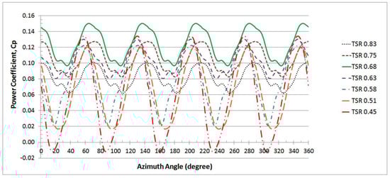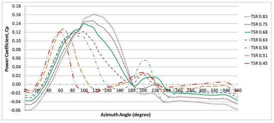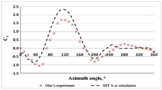 Diagram of the comparison of the coefficient of torque versus azimuth angle in Oler’s experiment and the simulation (TSR = 5.1). Reprint with permission [63]; 2012, University of Malaya.