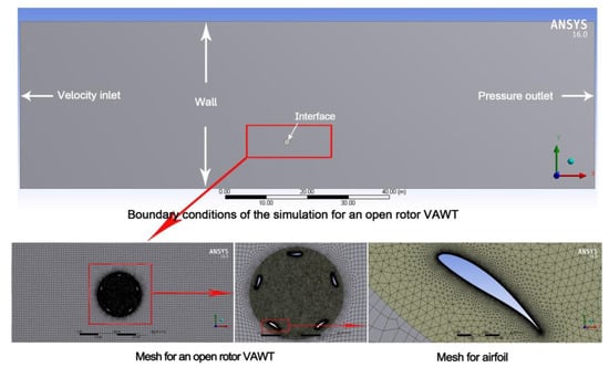 Geometry, boundary conditions and mesh used for the simulation model (open rotor VAWT).