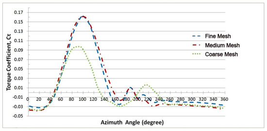 Figure 18 shows the instantaneous torque coefficient of one blade versus the azimuth angle. There is a little dissimilarity in the azimuth angle of 0° to 60° and 255° to 360° among the three cases, and the maximum torque coefficient is generated at the value around 100° for the three cases in the windward side. The solution of the coarse and fine (medium) meshes is different between the azimuth angle of 60–255°, while there is almost no obvious difference in the simulation results between the medium mesh and the fine mesh in all the 360 azimuth angles.