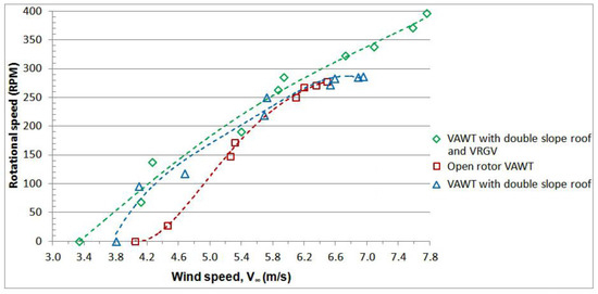 In this experiment, the rotor of the VAWT was in a free-running condition, only the bearing friction and inertial were considered. The on-coming wind velocity was increased gradually from 0 m/s to 6.5 m/s until the rotor started to run to obtain the self-start wind speed. The wind speed measurements were conducted by using a vane anemometer. The accuracy of the airflow measurement was ensured by repeating measurements five times at the same measurement point. The RPM of the free running VAWT at an oncoming wind speed of 6.5 m/s under the condition of an open rotor VAWT, with and without the VRGV, were recorded by a dynamometer controller system (Figure 13) after the rotational speed of the rotor was stabilized. According to this comparison experiment, it was found out that the wind speed passing through the region between the double slope roof and the VRGV can be augmented, and that the self-starting performance as well as the rotation speed of the VAWT can be preliminarily optimized by the VRGV design.