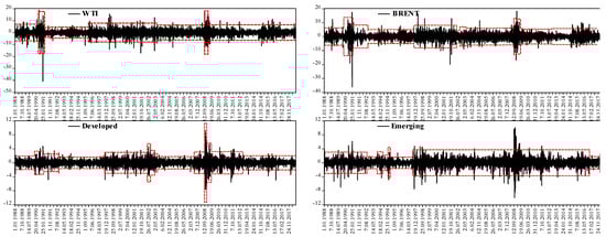 The IT test results suggest the existence of sudden change points (or, breaks) in the unconditional variance of all returns series. Specifically, we find seven sudden change points and 10 sudden change points for WTI and Brent oil price series, respectively. However, the MSCI emerging markets stock returns series have eight sudden changes points. The highest number of regime shifts points is detected for the MSCI G7 stock market returns series, where 13 structural breaks points are found.
