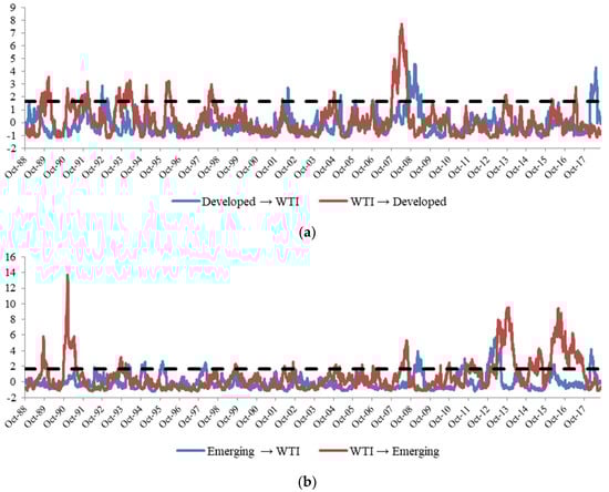 Panel (b) in Figure 3 indicates that there are volatility spillover effects from WTI crude oil price changes to MSCI emerging stock market returns in the late 1980s, 1990–1991, 1993, 1999, 2000–2001, 2007–2008, 2013–2014, and 2015–2017. We also find that return volatility in MSCI emerging stock markets Granger-cause the volatility of the WTI crude oil prices during the global financial crisis. The results in panel (c) show that the volatility spillover effects run mostly from MSCI G7 stock markets to MSCI emerging stock markets’ returns. Nevertheless, there is a period of feedback relationships as well. Note that the results in Table 5 indicate only unidirectional Granger-causality from MSCI G7 to MSCI emerging. Again, the time-varying Granger-causality tests shed more light into the understanding of the causal links between variables of interest.