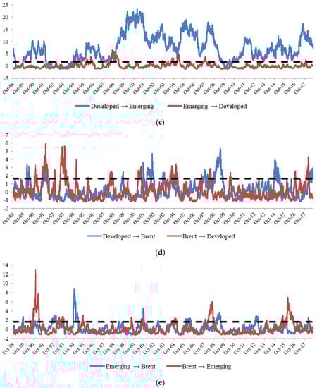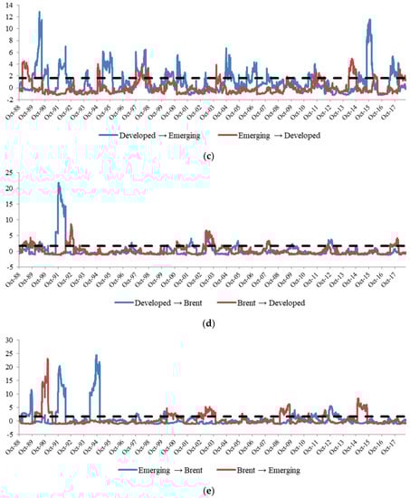 The time-varying causality-in-variance test results are presented in Figure 3, Panels (a)—(e). The time-varying Granger-causality-in-variance test results in Table 5 indicate only the presence of a bidirectional Granger-causal relationship (feedback) between MSCI G7 and MSCI emerging stock markets. Nevertheless, the time-varying causality-in-variance test results provide us a different picture. Time-varying causality-in-variance test results indicate the presence of bidirectional causal links among the crude oil price changes (both WTI and Brent) and global stock market returns at specific time periods. For instance, we find evidence for the existence of volatility spillover effects from crude oil price changes to the MSCI G7 stock market returns in the 1990s, 2001, 2004, 2007–2008, 2013, 2015, and at the end of 2016. The Granger-causal volatility spillovers from Brent oil price developments and MSCI G7 stock markets’ returns draw a similar picture to the results from the WTI oil prices. Similarly, the test results suggest a Granger-causal volatility spillover link running from MSCI G7 stock markets’ returns to price changes in the WTI crude oil market in 1991–1992, 2001, 2004–2005, 2008–2009, and, most recently, from late-2017 till mid-2018. The volatility spillover effects from MSCI G7 stock returns to Brent oil price developments has somewhat stronger effects in the late 1980s, 1991, 1999, 2000–2003, 2007-2008, 2014, and in 2018. It is interesting to note that the Granger-causal effects turn out to be significant in most episodes of economic crises.
