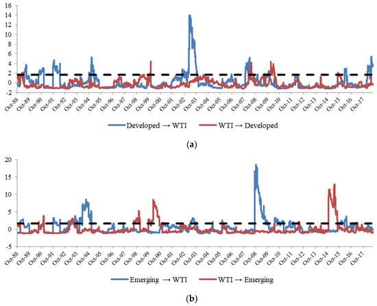 The MSCI Emerging Markets index used in our study includes 23 emerging markets’ countries, which can further be classified as oil exporting and oil importing countries. Therefore, we calculate two different emerging markets stock price indices, where the countries are classified as net oil exporting and importing. The oil exporting emerging market stock index covers the stock market indices of Brazil, Colombia, Mexico, Egypt, Russia, and Malaysia (we cannot consider Qatar and the United Arab Emirates (UAE) in calculating an index due to data availability. We cannot obtain the data for these countries before 2005). On the other hand, the oil importing emerging market stock index consists of the stock market index of 15 emerging markets. Due to data availability, we calculate the stock market indices for the period of 1 January 1994 to 27 August 2018. Next, we test for Granger-causal relationships between crude oil price changes (using both WTI and Brent oil prices) and stock market returns of oil exporting and importing countries. We employ the same methodology as discussed earlier. The results presented in Table 6 indicate that there is a bidirectional (feedback) relationship between Brent oil price changes and the stock market returns of oil importing and oil exporting countries. Hence, we find that there is no qualitative Granger-causal difference in the relationship between the oil-importing and oil-exporting emerging markets’ stock returns and Brent oil price changes. Nevertheless, we find that the WTI oil price changes unidirectionally Granger-cause the changes in the mean of the stock market returns. Stick market developments in oil-importing emerging markets do not Granger-cause the WTI oil price changes in mean. This might be arising since the Brent oil is more commonly used in oil-importing emerging markets than the WTI. A positive (negative) outlook in oil-importing emerging markets may not lead to increased (decreased) demand for WTI oil. In this context, Zhang and Chen [], Dagher and El Hariri [], and Jouini [] and Bouri [] found similar results and they showed the presence of a causal link between Brent oil price changes and stock market returns.