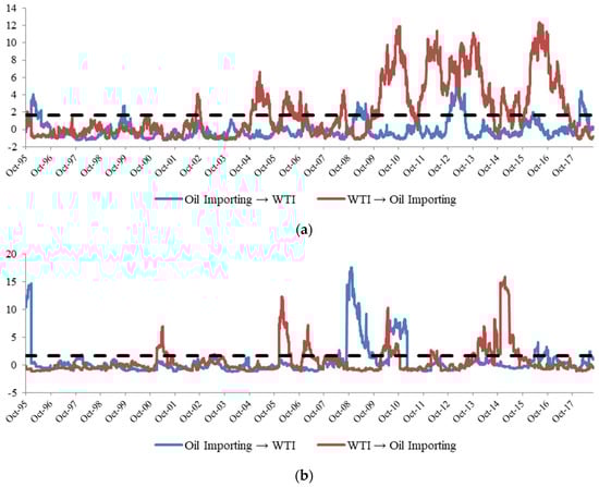 (a) Time-varying Granger-causality-in-mean test results between WTI oil prices and oil-importing emerging markets’ stock returns. (b) Time-varying Granger-causality-in-mean test results between WTI oil prices and oil-exporting emerging markets’ stock returns.