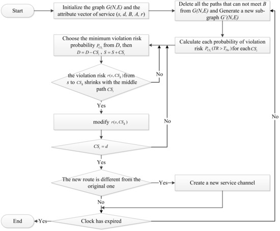 | (1) Initialize the graph G(N,E) and the aTTRibute vector of service (s, d, B, A, r). s, d, B, A and r(s,d) denote the source node, destination node, bandwidth requirements, availability threshold and the violation risk degree between s and d respectively. . When there is no channel between s and d, r(s,d) . Set S = {s}, D = G-s. (2) If the bandwidth of any path in the graph G(N,E) does not meet the bandwidth requirements B, then the path is deleted from G(N,E). Thus, a new sub-graph G’(N,E) is generated. (3) For each Calculate the probability of violation risk according to Equation (37). End for each. (4) Choose the with minimum violation risk probability from D, then , . (5) Take as the middle path, if the violation risk from s to shrinks, then modify . (6) Repeat step 4 and step 5 until . (7) If the new route is different from the original one, then a new service channel is created. Repeat Step 2 to Step 7. |
