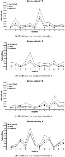 The simulation results are shown in Figure 8, which shows that the average service channel failure rate of SCVRD-R algorithm is respectively about 15% and 6% lower than that of AAR-OS algorithm and RAP algorithm under the different service intensities. Other service intensities are similar. The failure rate in the various service intensities has nothing to do with the change of month, just randomly changes within months. The temporal resolution of data is not necessarily fixed for month, which means that week or other durations can also be set as the temporal resolution of data.