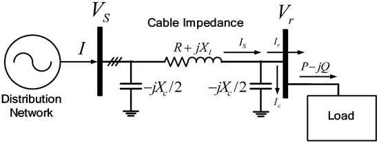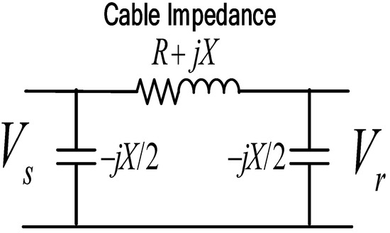 As with the transmission line, the submarine cable can be represented sufficiently well by the resistance (R), inductance (L), and capacitance (C). The difference between the transmission line and the submarine cable is in the short length. The transmission line assumed the shunt admittance of the line is small and can be neglected, but in the submarine cable, the shunt admittance is relatively high and can have an impact on the calculation, as shown in Figure 1. Therefore, in a short submarine cable, the shunt admittance is included in the calculation.