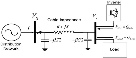 This shows that the bus voltage can increase or decrease depending on the amount of active and reactive power consumed at the load and supplied from the Distributed Generator (DG). Based on Equation (4), two conditions can result depending on the load capacity. The voltage difference in Equation (4) can be categorized into two parts: The first part is , and the second part is . In the heavy load condition, the first part is dominant, and the voltage difference, ΔVr, is positive, which means that there is a voltage drop at the receiving end. On the other hand, in light or no-load conditions, the second part is dominant, and the voltage difference, ΔVr, is negative, which means that there is a voltage rise at the receiving end [25]. This is the so-called “Ferranti Effect”.