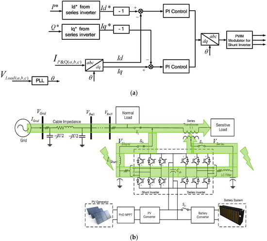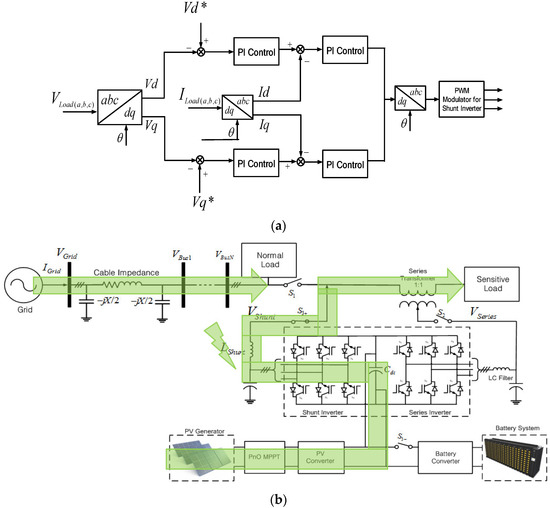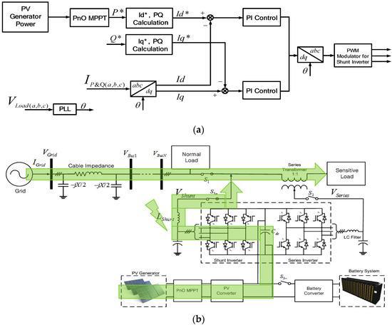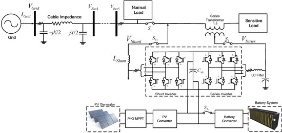 The conventional PV system delivers the power to the grid directly in the grid-connected mode or supplies the power to the load in stand-alone mode without any ability to improve the power quality. However, the proposed system, which has the back-to-back inverter topology of shunt and series inverters based on UPQC configuration, has the additional function of voltage compensation to the conventional PV system, as shown in Figure 4. The sensitive load can be separated from the normal load by disconnecting the switch, and it can be supported at a different power quality level from the normal load by the voltage compensation of the series inverter.