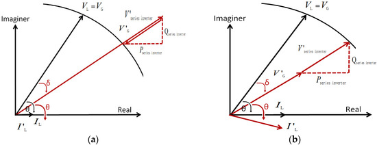 The series inverter is used to compensate for the voltage in the sensitive load in a weak grid system [26,27,28,29,30]. During the light load condition, as shown in Figure 5a, overvoltage, V’G, is occurred, and then the series inverter injected the negative voltage, V’series inverter, into the grid to mitigate it. On the other hand, during heavy load conditions, as shown in Figure 5b, undervoltage, V’G, occurs, so the series inverter injects the positive voltage, V’series inverter, into the grid to mitigate it.