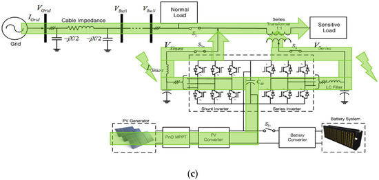 There are four switches in this proposed scheme. Switch 1, S1, is located between the grid and the sensitive load; Switch 2, S2, is between the series inverter and the sensitive load; Switch 3, S3+, is between the shunt inverter and the grid; and Switch 4, S3-, is between the BESS and inverters, respectively. The control scheme of switches for series and shunt inverters are based on the value of the grid voltage. If the sensitive load voltage is 0.9 to 1 pu, S1 is turned on. The shunt inverter is connected to the grid and supplies the power to the sensitive load without voltage compensation, as shown in Figure 11a,c. If the voltage magnitude is 0.8 to 0.9 pu, Switch S2 is turned on and the voltage compensation is applied by the series inverter, while the shunt inverter delivers the generated PV power to the grid through the shunt inverter. If the line voltage is lower than 0.8pu rated voltage, then both S1 and S2 are turned off, as shown in Figure 11a, to separate the sensitive load from the normal load. Then it operates as the stand-alone mode and the shunt inverter supplies the power directly to the sensitive load under the voltage control, while the normal load is supplied power from the grid with poor power quality.