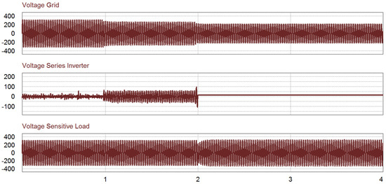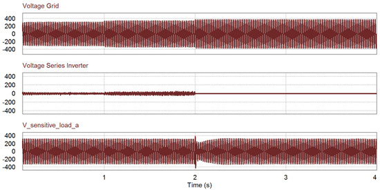 In this simulation, there are three cases within certain periods, as shown in Figure 13. Before 1 s, no undervoltage occurred. Therefore, there is no action from the series inverter while the shunt inverter injects the active power to the grid. During 1 < t < 2 s, the undervoltage occurs under 0.9 pu. The switch S2 is turned on and the series inverter injects the voltage to compensate for the grid voltage. After t > 2 s, if the voltage is lower than 0.8 pu, the shunt inverter takes care of the sensitive load in stand-alone mode while the grid covers the normal load in grid mode. In Figure 13c, it is verified that the voltage waveform of the sensitive load is well regulated during the undervoltage condition by the voltage compensation of the series inverter. In this period, the shunt inverter control is transferred from the power control mode to the voltage control mode.