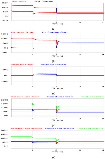 The power flow under the overvoltage case is same as that of undervoltage case as shown in Figure 16. Before 1 s, the grid is under the normal condition, so there is no power flow through the series inverter while the shunt inverter injects the generated PV power to the grid system. When the overvoltage occurs during 1 < t < 2 s, the series inverter compensates for the voltage while the remaining PV generating power flows through the shunt inverter as shown in Figure 16b,c. The active and reactive power of sensitive load is constant in this period since the series inverter compensates for the overvoltage through the series inverter as shown in Figure 16d,e. During the last period (t > 2 s), the grid voltage is higher than 1.2 pu. The series inverter is in off mode and the shunt inverter takes care of the sensitive load in the stand-alone mode. Therefore, the normal load is covered by the grid as shown in Figure 16a,d,e, while the shunt inverter supplies the power to the sensitive load only, as shown in Figure 16c‒e.