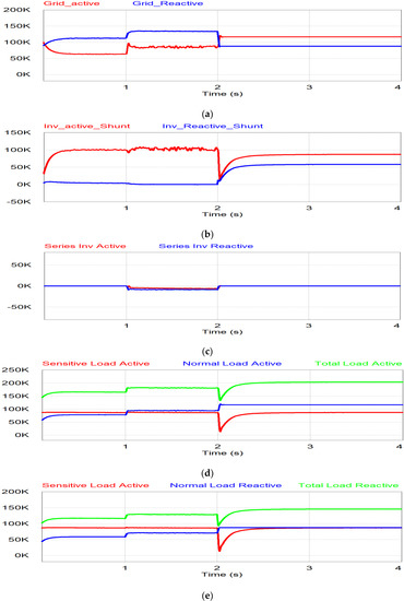 The simulation results for power flow are shown in Figure 14. During the period t < 1 s, the grid injects power for the normal condition as shown in Figure 14a. In Figure 14b,c, there is no power flow through the series inverter, which is in the off position, but the shunt inverter injects the active power generated by PV to the grid system. When undervoltage occurs during 1 < t < 2 s, the grid power is decreased due to the voltage drop, as shown in Figure 14a. The series inverter injects the power to compensate for the undervoltage, while the remaining PV generating power flows through the shunt inverter, as shown in Figure 14b,c. The active and reactive power of sensitive load are constant in this period since the series inverter compensates for the undervoltage through the series inverter as shown in Figure 14d,e. During the last period (t > 2 s), the grid voltage is less than 0.8 pu. The series inverter is in off mode and the shunt inverter takes care of the sensitive load in the stand-alone mode. Therefore, the normal load is covered by the grid as shown in Figure 14a,d,e, while the shunt inverter supplies the power to the sensitive load, separate from the normal load, as shown in Figure 14c–e.