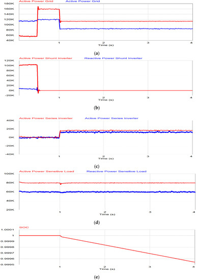 Simulation results of BESS: (a) Grid power; (b) shunt inverter power; (c) series inverter power; (d) active and reactive power for sensitive load; (e) SoC of BESS.