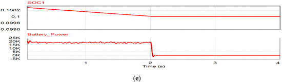This case is the condition of low irradiance or during the night. Figure 17a shows the voltage compensation after 1 s by discharging the battery. Before 0.5 s, the PV-generated power is supplied to the grid through the shunt inverter, so the grid injects less active power to the grid due to the power delivery of shunt inverter shown in Figure 17a‒c. During 0.5 to 1.0 s, the PV cannot generate active power due to the low irradiance condition and the grid injects more power to the loads shown in Figure 17a. After t > 1.0 s, undervoltage occurs, so the BESS supplies power to the series inverter to compensate for the voltage shown in Figure 17b,c. The active and reactive power for the sensitive load can stay constant, as shown in Figure 17d. During this range, the BESS can be the power source of the series inverter instead of the PV power source, so the SoC of BESS is reduced due to the power supply to the series inverter, as shown in Figure 17e.