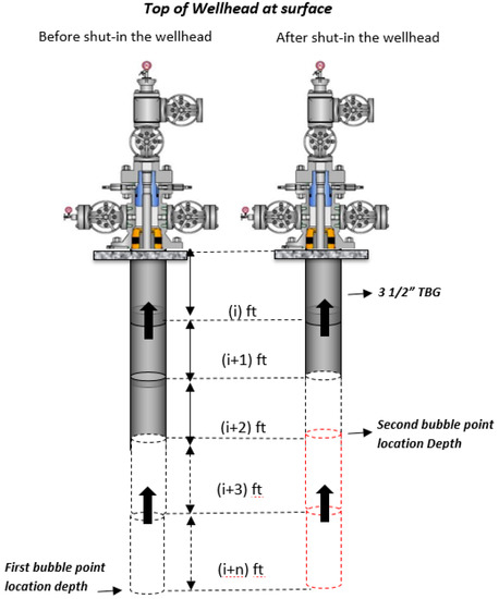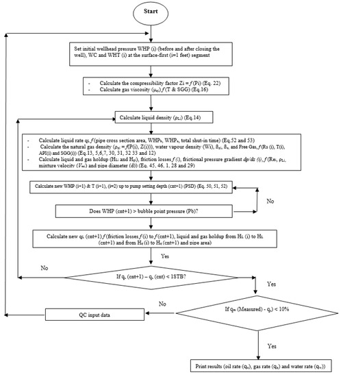 Figure 4 shows the algorithm steps to evaluate the mathematical model. The algorithm classified all the main stages and sub-steps in the model. In this process, the calculations were performed to obtain the bubble point pressure location depth before and after the wellhead wing valve shut-in. The fluid flowing pressure gradient could be calculated anywhere inside the pipe. All the variables needed to be identified to correctly evaluate the physics interactions between all the fluid parameters using the suitable multi-physics equations and empirical correlations.