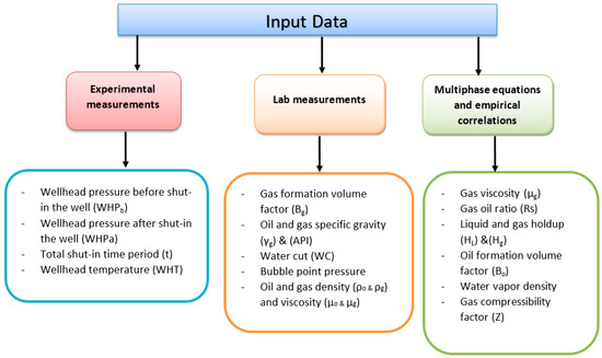 The input data required were the well parameters data and physical properties data of the fluid, as seen in Table 1. To carry out this study, 48 ESP oil wells were selected where the wells were producing from four different reservoirs using same production pipe diameter. Also, these reservoirs had almost the same reservoir fluid properties: the bubble point pressure ranged from 924 psi to 1124 psi, the American Petroleum Institute (API) oil gravity ranged from 36 to 37 @ 60 °F, the oil viscosity ranged from 0.784 cP to 1.0119 cP, and the reservoir temperature ranged from 157 °F to 186 °F. Furthermore, Figure 3 classifies the input data required.