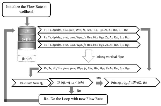 The calculation starts at the surface wellhead and then down to the location depth of the bubble point pressure as a function of temperature and pressure variations with depth. To consider the fact that flow regimes vary depending on the in situ flow rates of gas/liquid, the model calculates, at each foot along the vertical pipe, the variations of supercritical velocities, viscosities, and densities for both phases (liquid and gas). The in situ flow rate can also be calculated by the mathematical model at any flow regime at any depth. As shown in Figure 5 and Figure 6, the calculation iteration can stop at any depth (i, ..., i + n) using all the equations (from Equation (1) to Equation (56)), where there is a different flow regime along the vertical pipe.