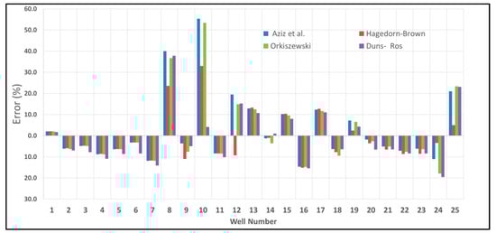 To make sure that the obtained liquid and gas hold-up is accurate, some popular correlations, used by the industry and are included in almost every commercial software package, were considered to predict the liquid and gas hold-up inside each well. The correlations considered in this study are the ones developed by Hagedorn and Brown [31], Duns and Ros [32], Orkiszewski [33], and Aziz et al. [34]. The statistical results for the various prediction methods when applied to all 25 well tests are shown in Figure 7 and Table 3. These results indicate that the Hagedorn and Brown correlation seems to predict liquid and gas hold-up better than the other correlations selected in this study. However, the overall results show minor differences between the different correlations. This is because each correlation was developed based on certain assumption and for a particular range of data.