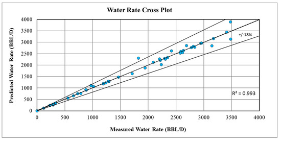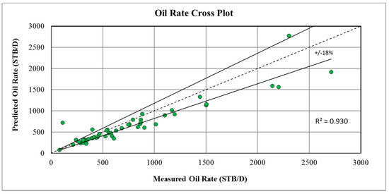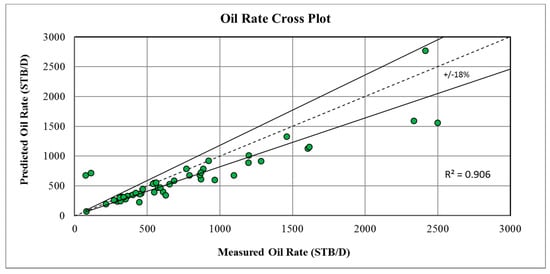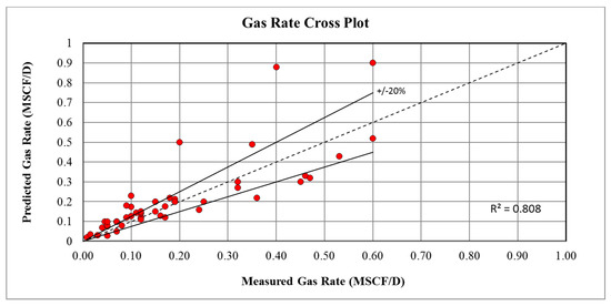 By using the Blasius friction factor correlation, the differences between the predicted flow rate and the measured flow rate were very small. R-squared (R2) explained exactly how the data points were fitted close to the regression line (). Figure 8, Figure 9 and Figure 10 displayed the regression model for oil, water, and gas flow rate measurements. It can be seen that the plots show that most data points lie on or close to the unit slope line (e.g., best fit line), indicating that the predicted and actual values were in excellent agreement and illustrated an accurate flow rate prediction for oil, water, and gas with good correlating coefficients of 0.994, 0.993, and 0.966, respectively. This means that 99.4%, 99.3%, and 96.6% of the variance in the oil, water, and gas data, respectively, was explained by the line and 0.6%, 0.7%, and 3.4% of the variance was due to unexplained effects. The figures show that the predicted wells flow rates fell within the accepted uncertainty when compared with the measured flow rates.