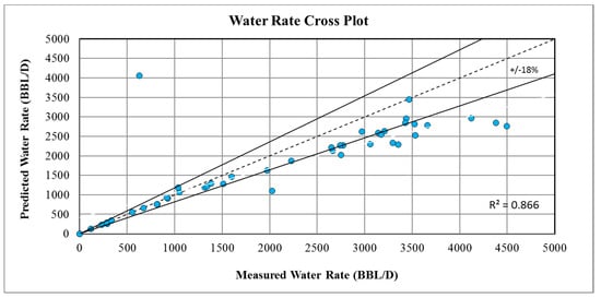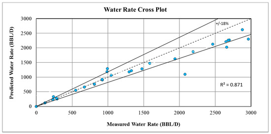 Predicted vs measured water rate using the Darcy correlation.