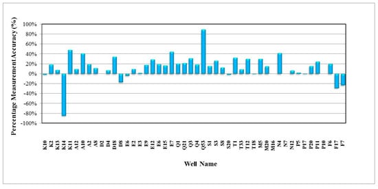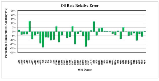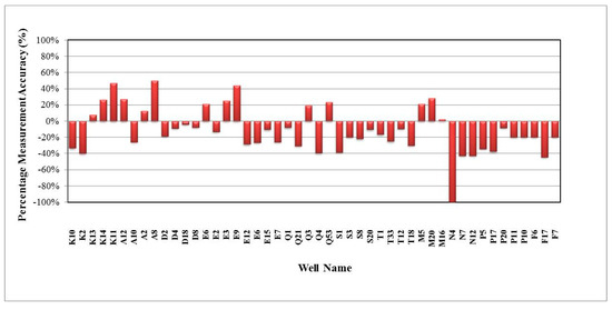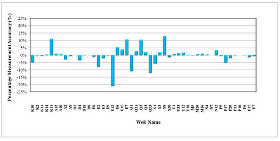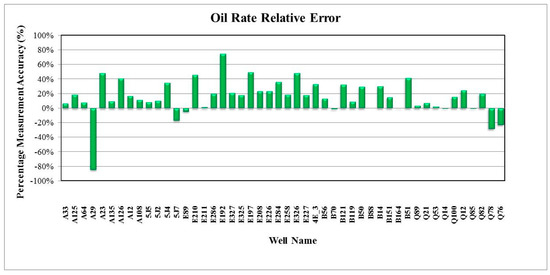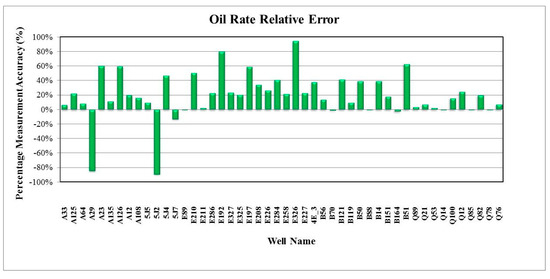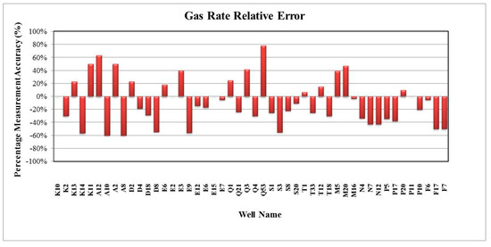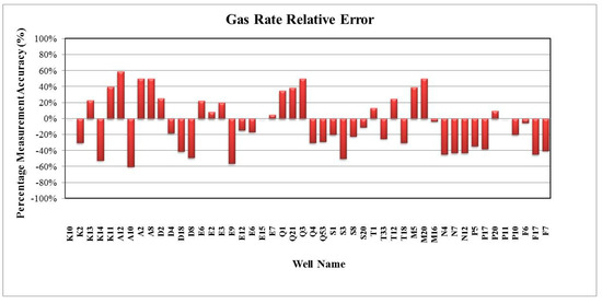 In general, the validation results of the predicted fluid flow rates were satisfactory when using the Blasius correlation rather than the Darcy or Colebrook correlations, where 96% and 98% of the predicted fluid flow rates were in good agreement with the real measured oil and water flow rate, respectively. Furthermore, the relative errors were less than ±18%, which were still within the reasonable uncertainty, as shown in Figure 17 and Figure 18. For the predicted and measured gas rates, 68% of the wells showed about ±10% relative errors, as shown in Figure 19. By using the Darcy correlation, 63% and 70% of the wells were not in good agreement with the predicted and measured oil and water rate, respectively, with more than ±18% for relative errors, as shown in Figure 20 and Figure 21. For predicted and measured gas rates, 79% of the wells showed more than ±10% relative errors, as shown in Figure 22. By using the Colebrook correlation, 67% and 75% of the wells were not in good agreement with the predicted and measured oil and water rate, respectively, with more than ±18% relative errors, as shown in Figure 23 and Figure 24. For predicted and measured gas rates, 77% of the wells showed more than ±10% relative errors, as shown in Figure 25.